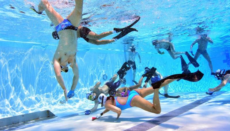 Underwater Hockey is a team sport that takes place at the bottom of a swimming pool. The intention is to get the puck, which is about 1300 grams, as often as possible in the opponent's goal. A team consists of 6 field players and a maximum of 4 alternators. The players wear the color of their team (black/white) on their cap. The players have a small hockey stick (that is convenient for use under water) in the same color. The referees wear a red cap and a yellow shirt. A match lasts 30 minutes (2x15 minutes). The game is about speed, technique and ... a long breath.