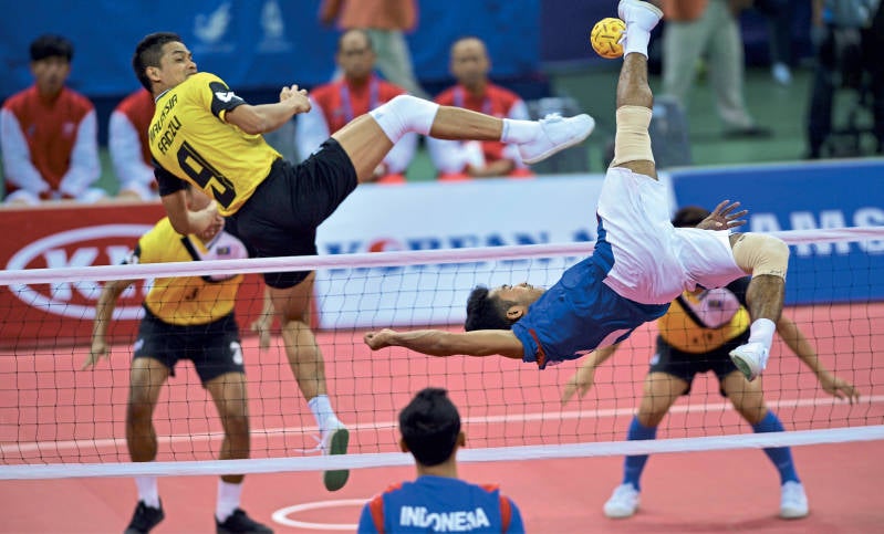 Sepak Takraw is a traditional ball sport in South East Asia. Takraw is described as football-volleyball. In contrast to volleyball, you can't touch the ball with your hands with takraw, only with your head, shoulder, knee and foot. The net hangs about one and a half meters high. The players can score by getting the ball on the opponents' field, within the limits. Unlike volleyball, Takraw is played with only three players in a team.